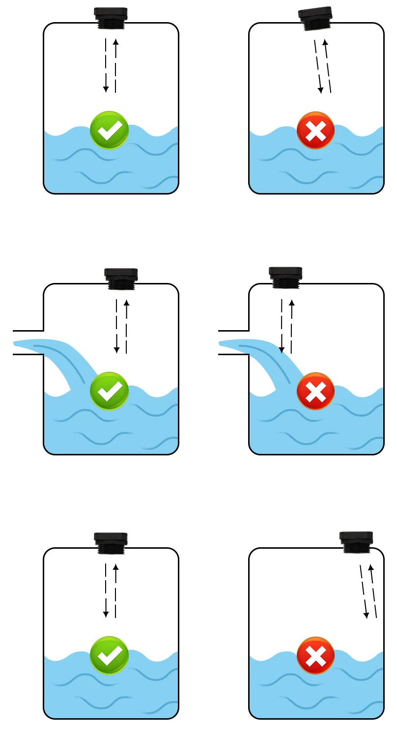 - Installation: perpendicular to the tank bottom, away from side water streams, as close to the tank center as possible