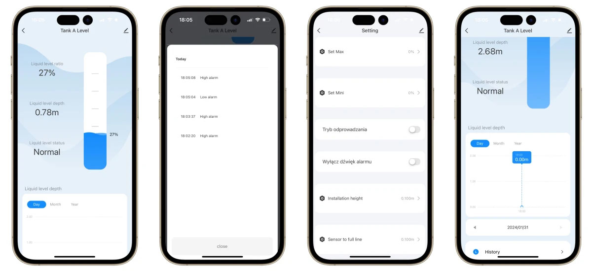 The TUYA Smart app allows real-time monitoring of liquid levels, alerts on threshold exceedances, and enables custom automation scenarios.