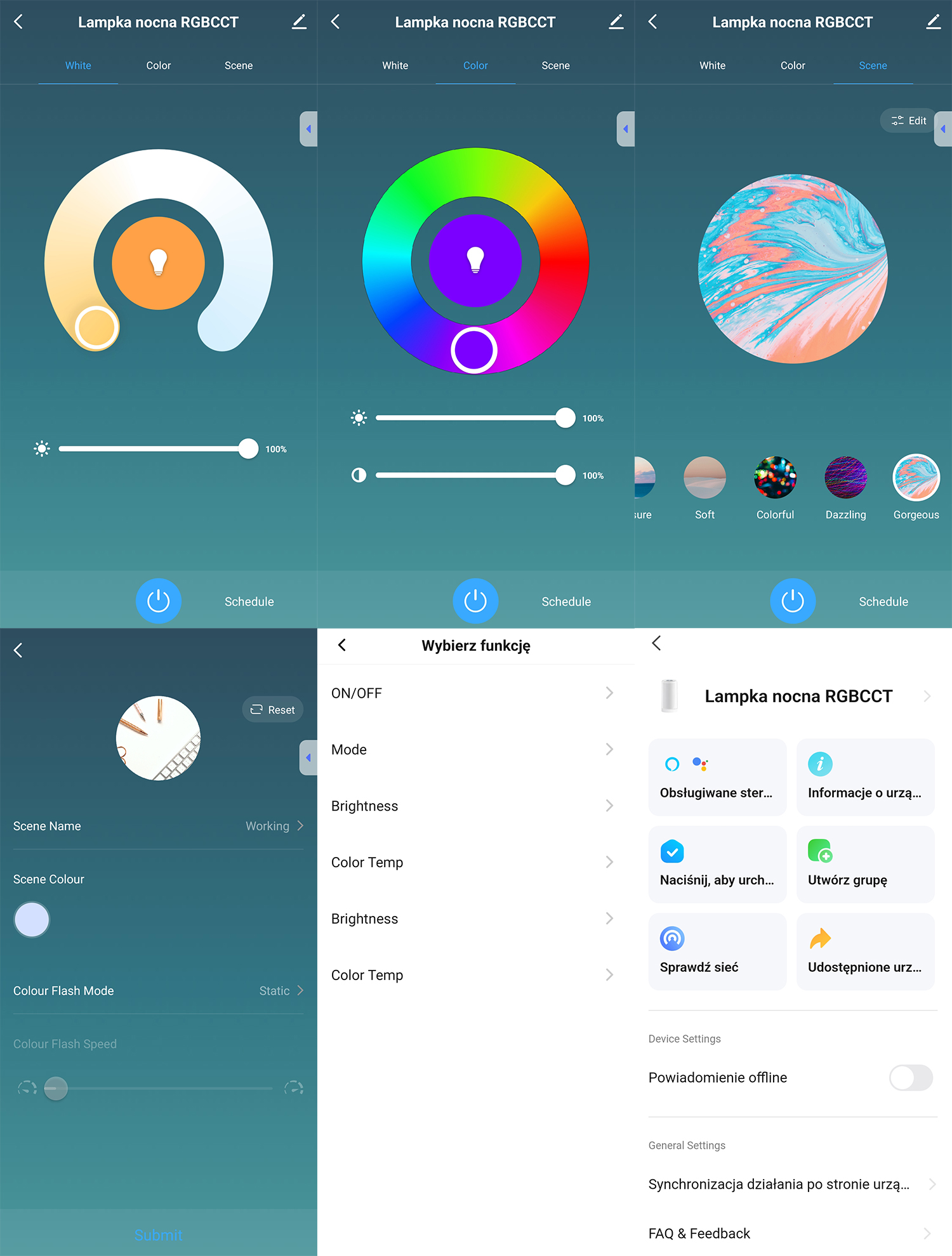 - Z poziomu aplikacji możemy sterować włączaniem/wyłączaniem, kolorami, barwą koloru białego, jasnością, wyborem scen oraz ustawianiem harmonogramów pracy urządzenia