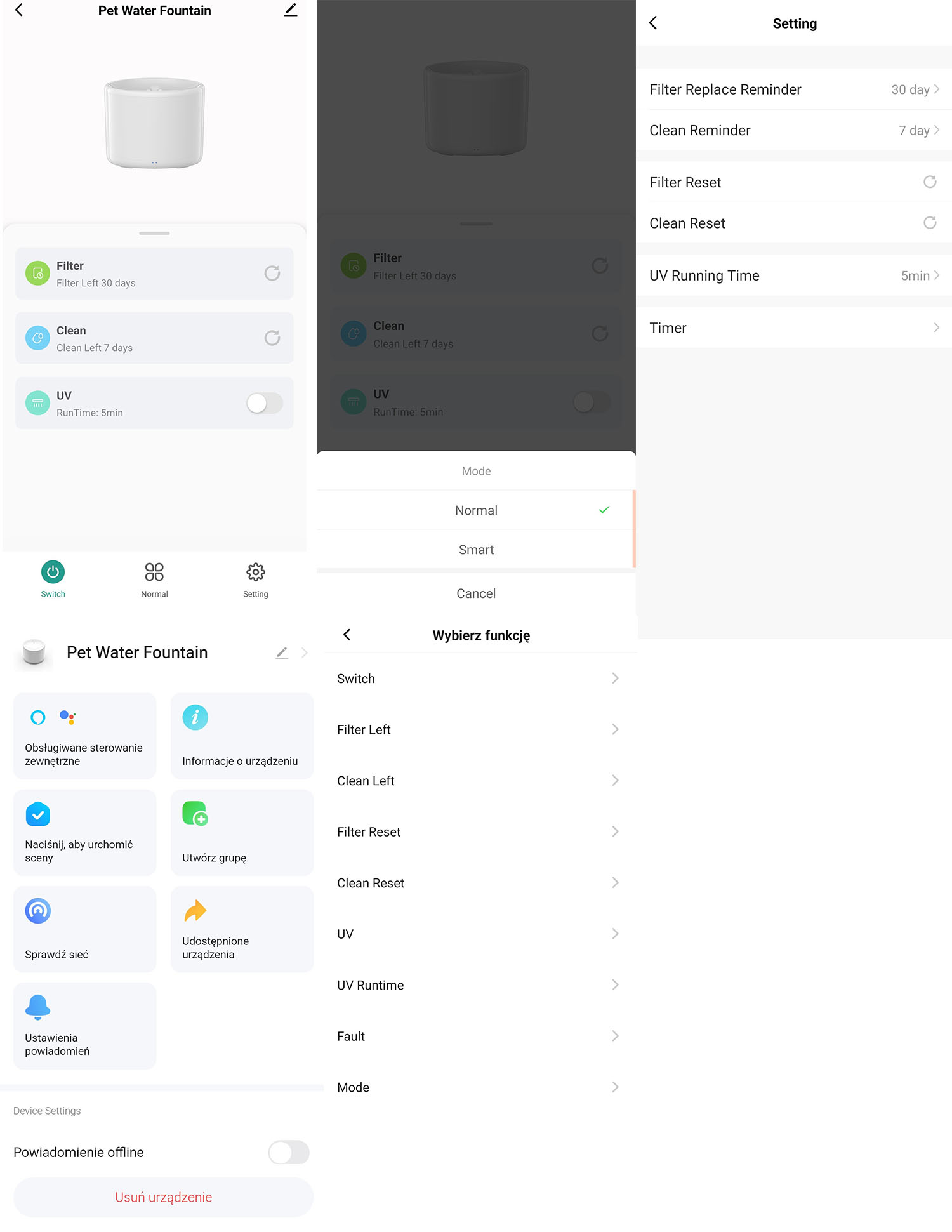 Za pomocą aplikacji TUYA mamy możliwość ustawienia między innymi przypomnienia o wymianie filtra, czyszczeniu poidła oraz ustawienia harmonogramów działania.