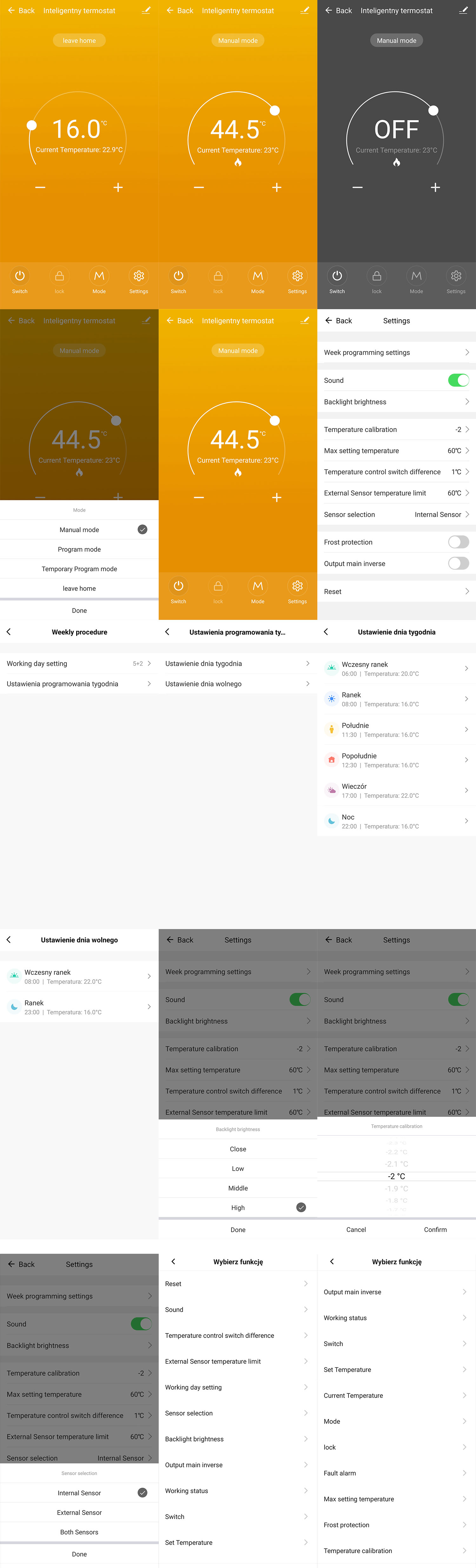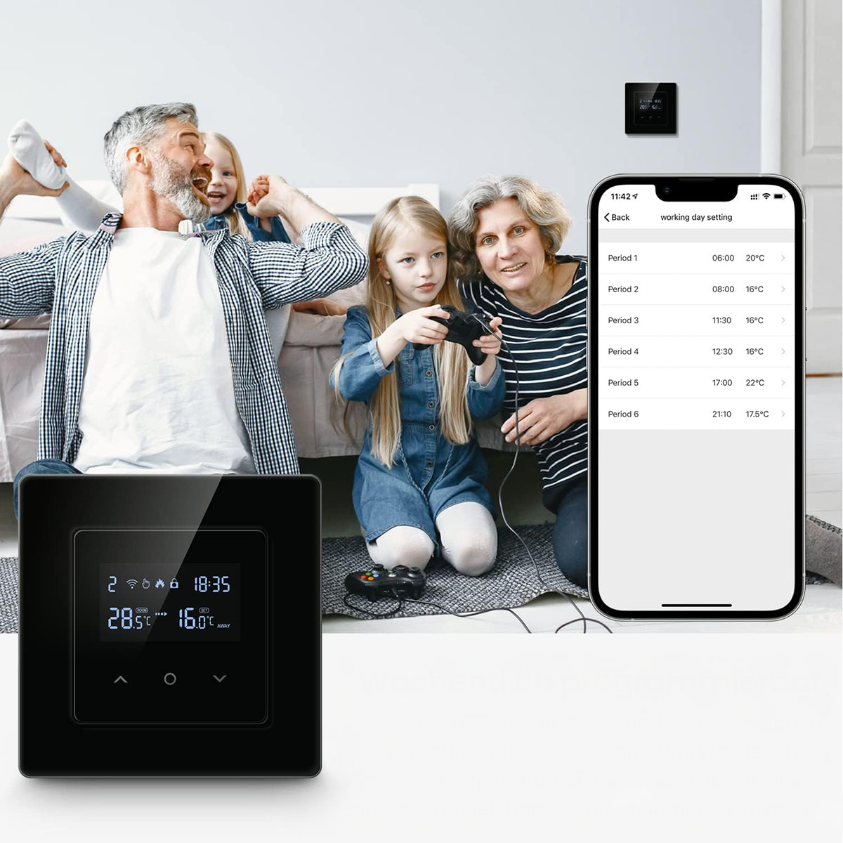 Za pomocą aplikacji TUYA lub Smart Life, możesz łatwo zaprogramować działanie termostatu na 5+2, 6+1 lub 7 dni, z możliwością ustawienia do 6 zmian temperatury dziennie.