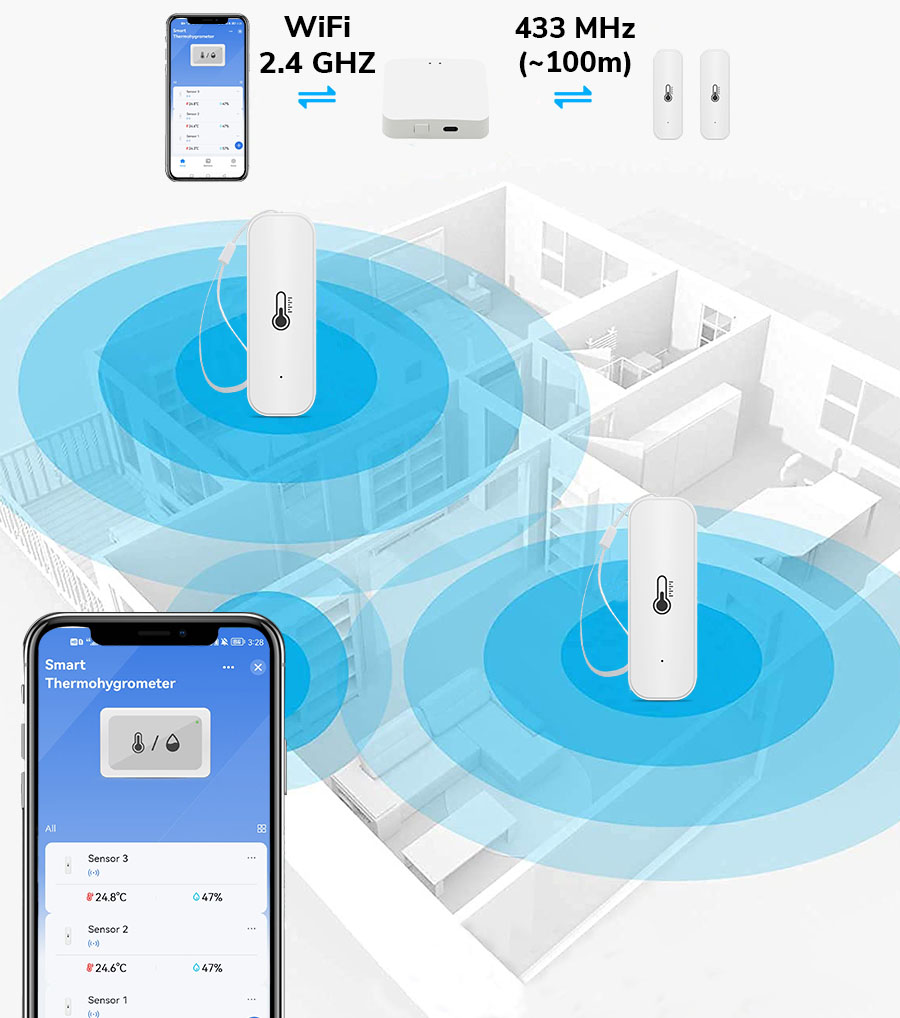 Bezprzewodowe połączenie WiFi 2.4 GHz i zasięg 433 MHz zapewniają stabilną komunikację pomiędzy czujnikami a bramą.