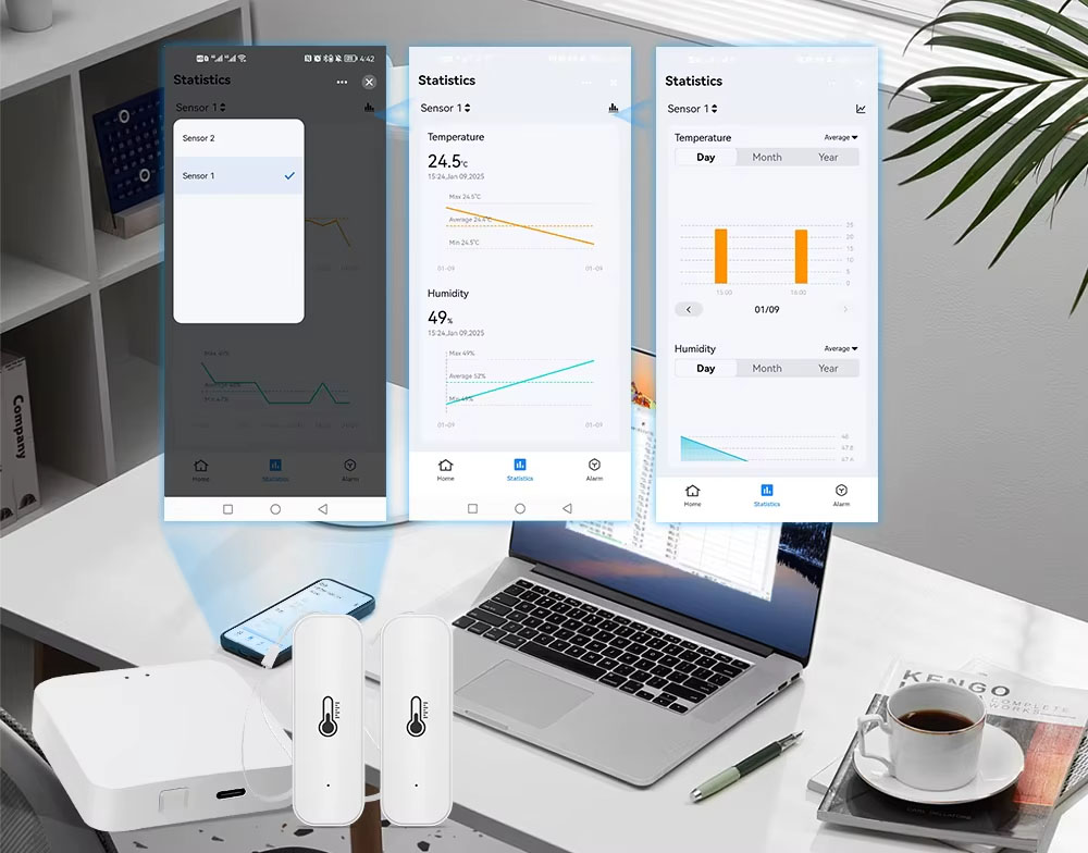 ✅ Kompleksowy monitoring: Monitoruj temperaturę i wilgotność w całym domu, przeglądaj historię i eksportuj dane do 1 roku wstecz.