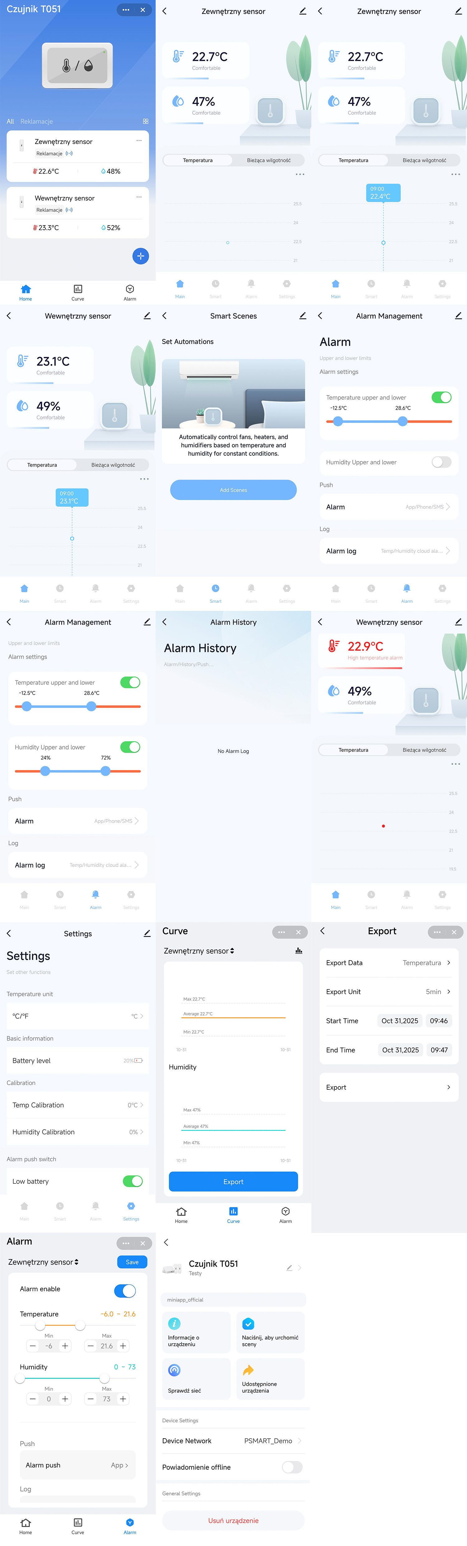 - Alarmy i powiadomienia: konfigurowalne progi temperatury i wilgotności