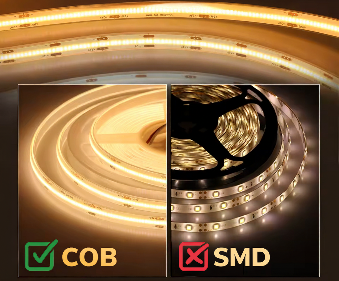 Taśmy COB świecą inaczej niż zwykłe taśmy LED SMD - równiej, płynniej, jaśniej i bez zauważalnych przerw.