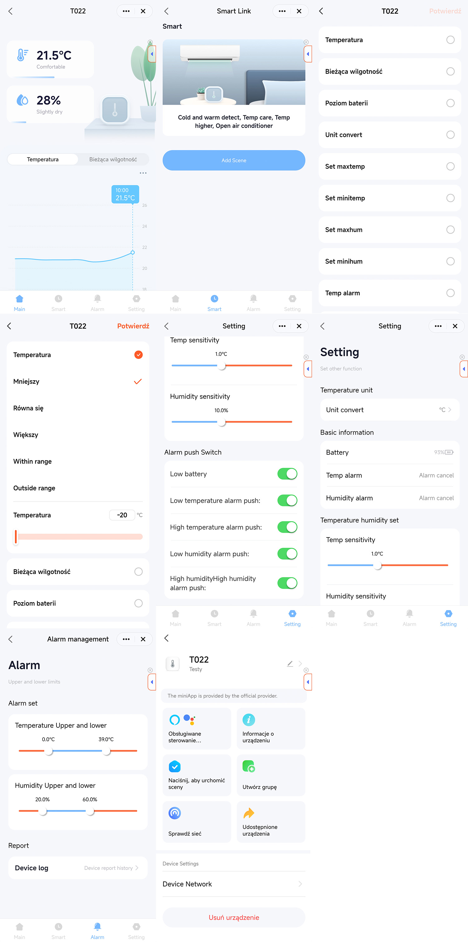 ✅ Alarmy i powiadomienia: Alarmy temperatury i wilgotności z możliwością ustawienia progów w aplikacji.