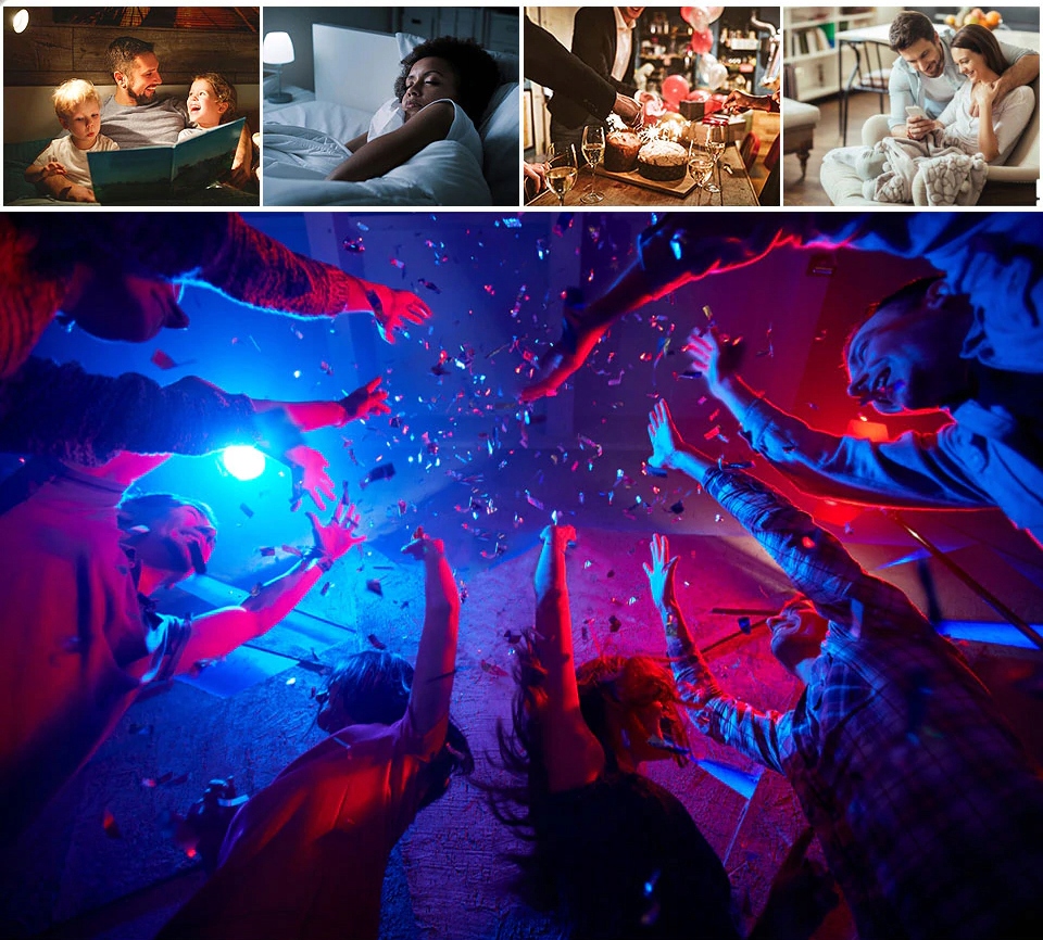 - Możliwość tworzenia automatyzacji i scenariuszy z dostosowaniem koloru, jasności oraz temperatury barwy! Np.: o godzinie 18 zasłoń rolety, włącz światła LED i ustaw kolor niebieski.