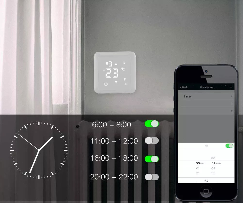 Programowanie tygodniowe do 6 cykli dziennie. ✨ Dzięki aplikacji TUYA ustawisz harmonogram dostosowany do swojego trybu życia – np. obniżenie °C nocą lub podczas nieobecności. Sterowanie możliwe z dowolnej lokalizacji z dostępem do Internetu.